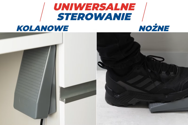 Konstrukcja pedału sterowania pozwala na regulację obrotów stopą lub montaż z boku szafki i sterowanie kolanem.
