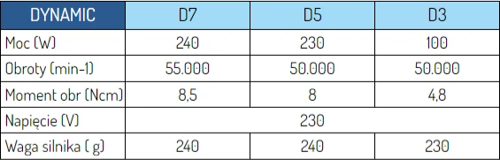DYNAMIC D5 dysponując 230 W tylko nieznacznie ustępuje modelowi D7 pod względem mocy. Konstrukcja silnika minimalizuje wibracje dostarczając wystarczającej mocy zarówno przy niskich jak i wysokich prędkościach.