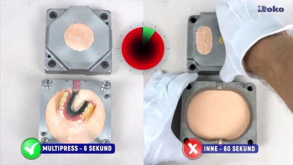 Wykonanie protez w technologii 4 PRESS jest proste. Wymodelowaną z wosku i zatopioną w pierścieniu pracę umieszczamy w piecu do wygrzewania a następnie wstawiamy do wtryskarki. Po uruchomieniu prasy, proces wtrysku wykonywany jest automatycznie.
