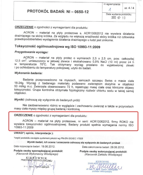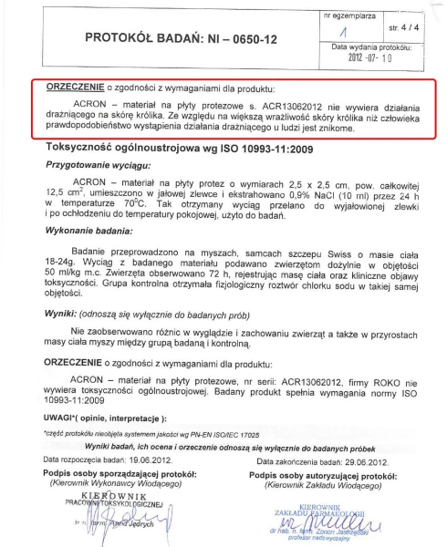 ACRON został uznany za najlepszy materiał na płyty protez dentystycznych na wystawach: NORYMBERGA/ NIEMCY/IENA, WARSZAWA/POLSKA/IWIS, TAJ PEJ/TAJWAN/IIPNF, KRAKÓW/POLSKA/KRAKDENT.