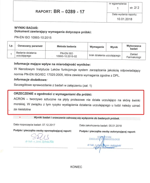ACRON został gruntownie przebadany i przetestowany. Badania Narodowego Instytutu Leków wykazały, że nie zawiera substancji toksycznych i drażniących. Jest bezpieczny dla pacjentów i personelu medycznego.